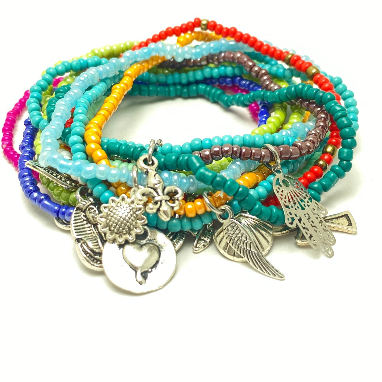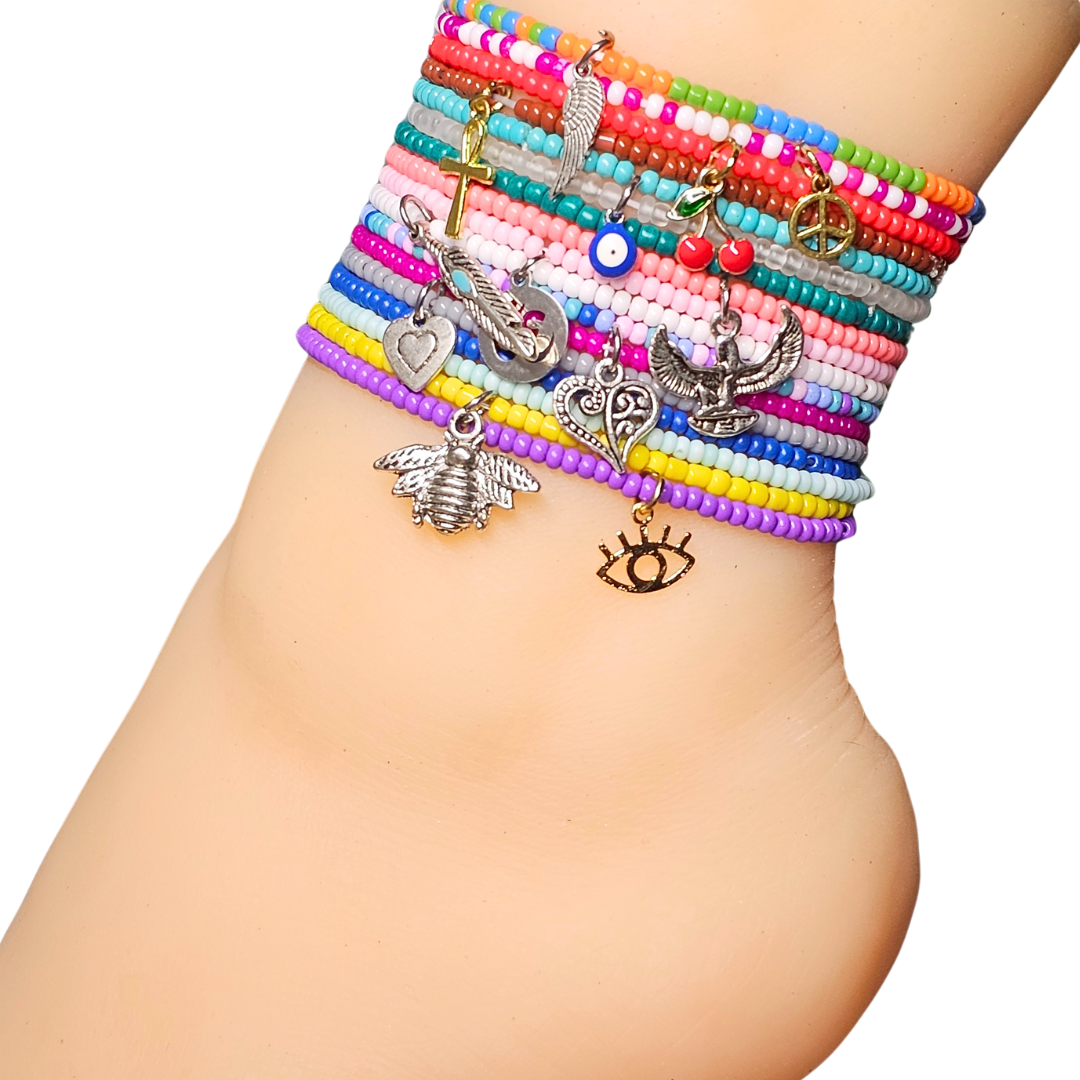 Discover a fun mix of style and meaning with this 5pc Anklet Grab Bag with Charms. Each anklet is handmade with vibrant beads and finished with a charm accent that adds personality and flair. Made with stretch cord for a comfortable and flexible fit.
