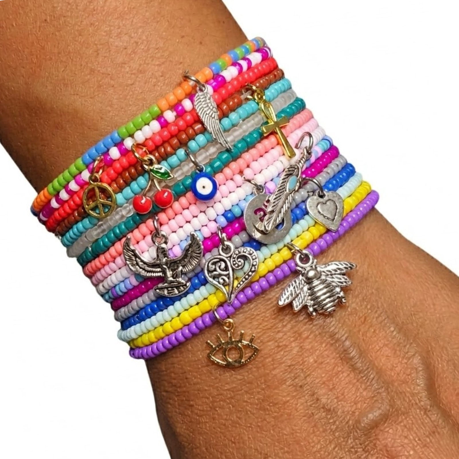 Get a surprise mix of 10pc charm bracelets made with vibrant seed beads. Each bracelet is unique and features various charms, colors, and patterns. Made on stretch cord to comfortably fit most wrists. Great for stacking or gifting.