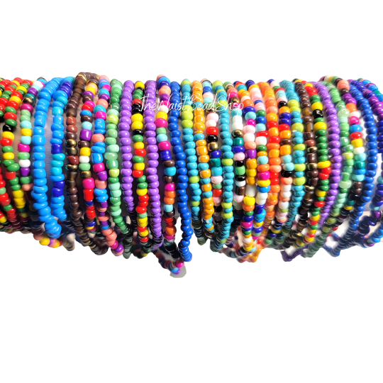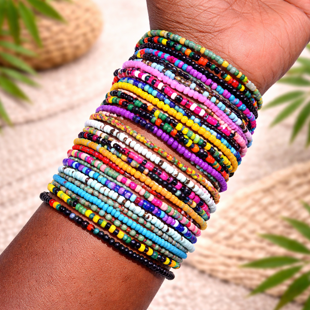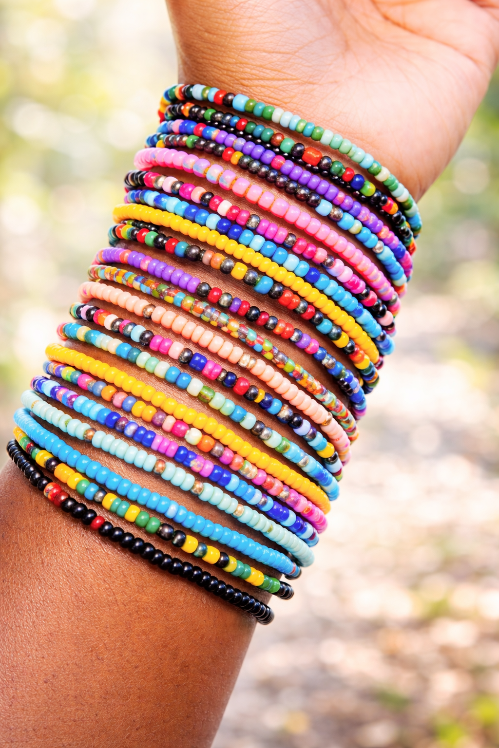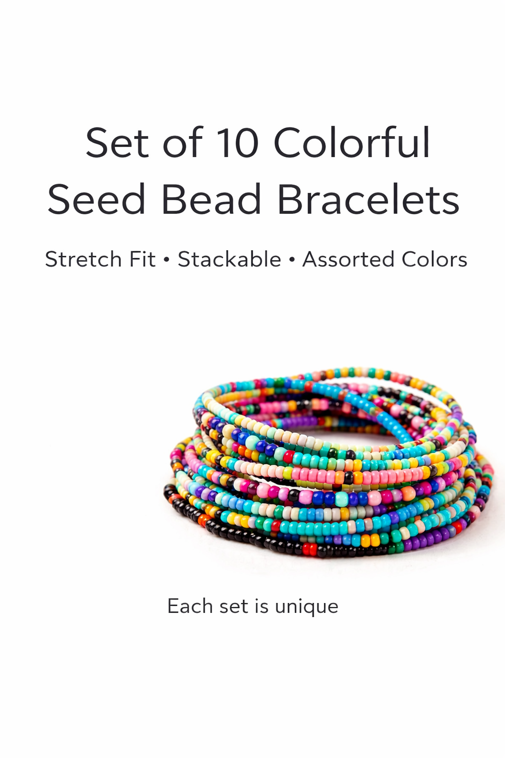 Set of 10 vibrant mixed-color bracelets made with seed beads and stretch cord for easy wear.