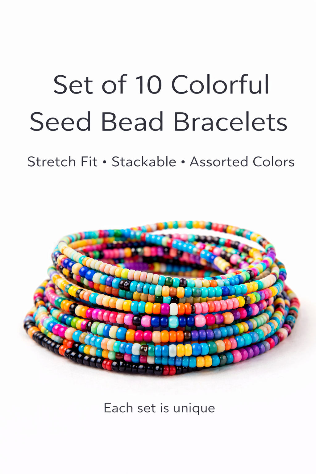 Fun and colorful 10-piece bracelet mix with bright bead combinations and easy stretch wear.