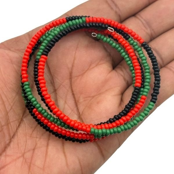 Celebrate culture and color with this handcrafted memory wire bracelet, designed with vibrant red, black, and green seed beads in a bold, repeating pattern. The flexible memory wire structure wraps comfortably around the wrist, creating a stacked look without the need for a clasp.